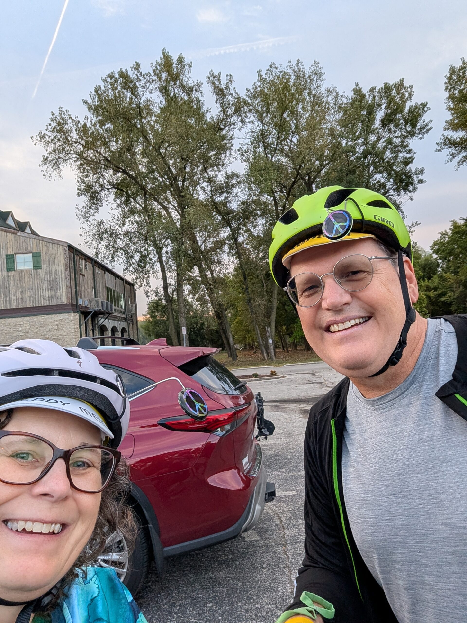 The rest of the ride today was uneventful. We stayed fed and hydrated, yay! We saw 3 box turtles on the trail, a little green snake, and a couple of deer, one of which was making sure its 2 fawns got safely away from us 🙂 We are in the same B&B we stayed in here last time. The ownership has changed, but it’s still quite nice. We had dinner at the winery just a short walk down the road and got our laundry done in the complimentary laundry room here.